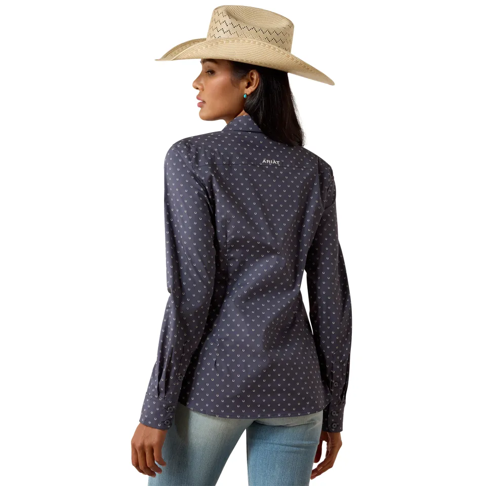 Das Ariat Western Kirby Shirt in der Farbe OMBRE BLUE HORSESHOE ist die perfekte Wahl für alle Reiter, die Wert auf Komfort, Funktionalität und Stil legen. Dieses Shirt wurde sorgfältig von Reitern getestet und ist Teil der R.E.A.L. Kollektion, die Performance-Features und hochwertige Stoffe vereint, um eine hervorragende Passform, Langlebigkeit und einen modernen Look zu gewährleisten. Das Shirt besticht durch seine qualitativ hochwertige Verarbeitung, die Bewegungsfreiheit fördert, sowie durch sein ansprechendes Design. Die durchdachten Nähte sorgen für eine schmeichelhafte Silhouette, während die speziellen Merkmale wie die größere Armfreiheit, die tapeierte Knopfleiste und der Stehkragen für zusätzlichen Komfort sorgen. Das Stretch-Poplin-Material ist knitterresistent und sorgt für ein gepflegtes Erscheinungsbild, egal wie aktiv Ihr Tag ist.