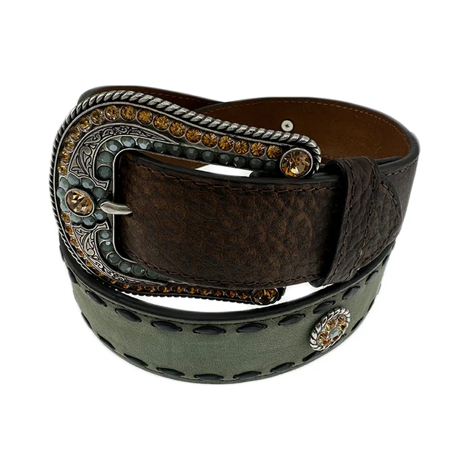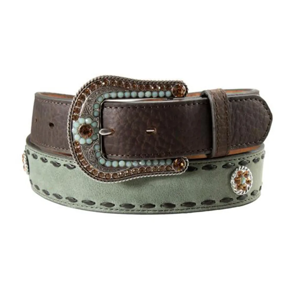 Der Damen Western-Gürtel von Nocona ist ein atemberaubendes Accessoire, das Western-Style auf elegante Weise verbindet. Dieser Gürtel besteht aus hochwertigem braunem Leder mit einer stilvollen Struktur, die ihm eine robuste und gleichzeitig edle Optik verleiht. Das Design wird durch ein kontrastierendes jadefarbenes Wildleder-Element ergänzt, das dem Gürtel eine faszinierende Farbvariation und einen einzigartigen Charakter verleiht. Die braunen Nähte setzen dezente Akzente und unterstreichen die handwerkliche Qualität.