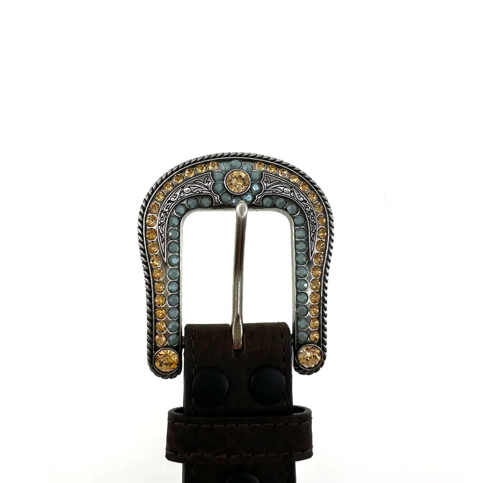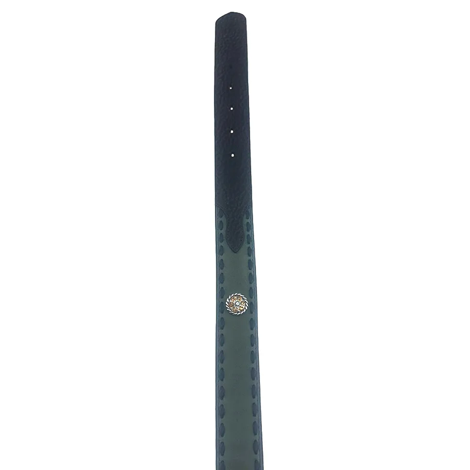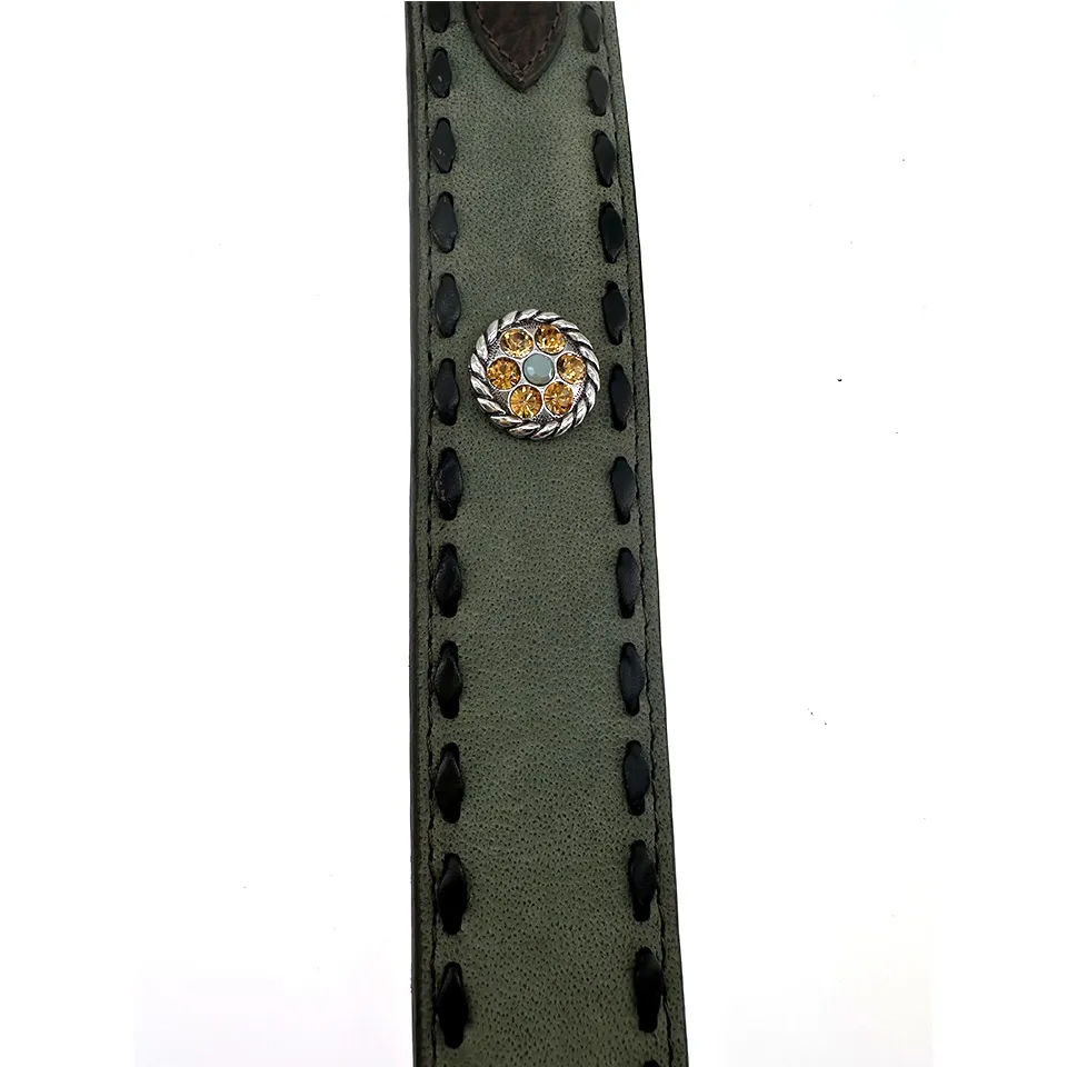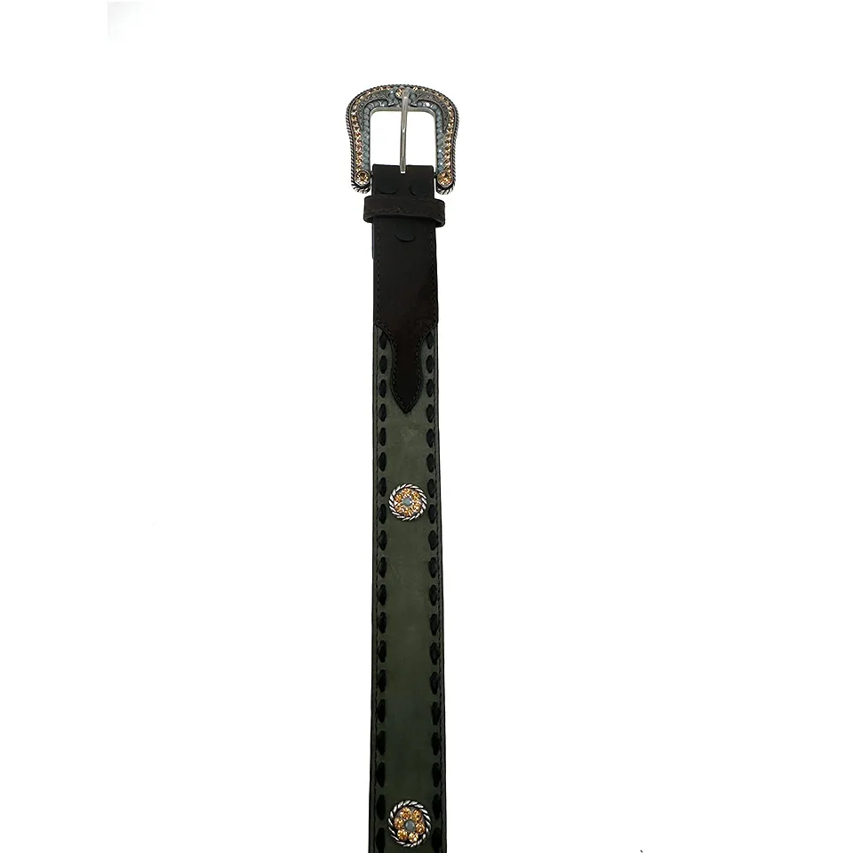 Als Highlight schmücken kleine Conchos, verziert mit funkelnden Gold- und Jade-Glitzersteinen, den Gürtel und verleihen ihm einen besonderen Glanz. Die passende Gürtelschließe ist ebenfalls mit ähnlichen Verzierungen gestaltet und harmoniert perfekt mit den Conchos, was den Gürtel zu einem echten Blickfang macht.
