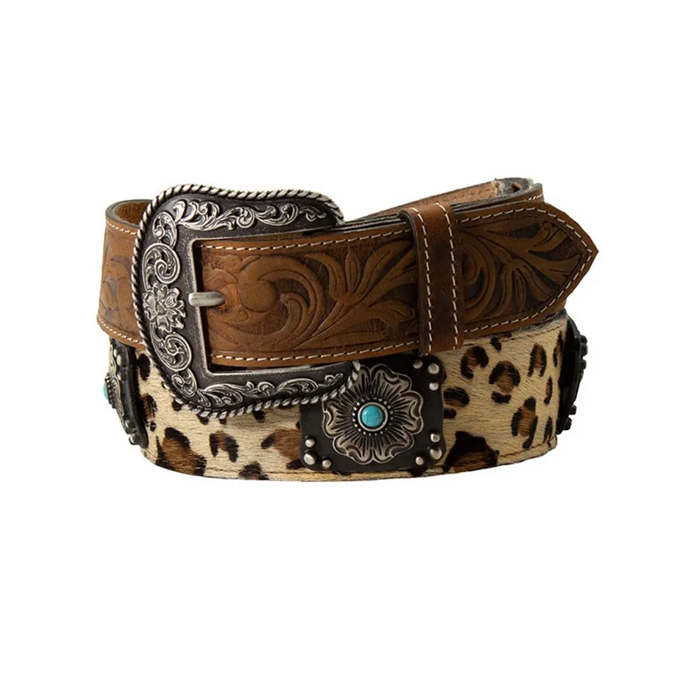 Entdecken Sie den exquisiten Damen-Westerngürtel von Nocona – das perfekte Accessoire für alle Cowgirls und Westernliebhaberinnen. Dieser Gürtel vereint rustikale Eleganz und filigrane Details auf einzigartige Weise. Das hochwertige braune Leder ist kunstvoll mit einer feinen Punzierung verziert, die dem Gürtel eine zarte Struktur verleiht. Ergänzt wird das Design durch einen stilvollen Leo-Look aus Kuhfell, das dem Gürtel einen wildlederartigen Charme verleiht.