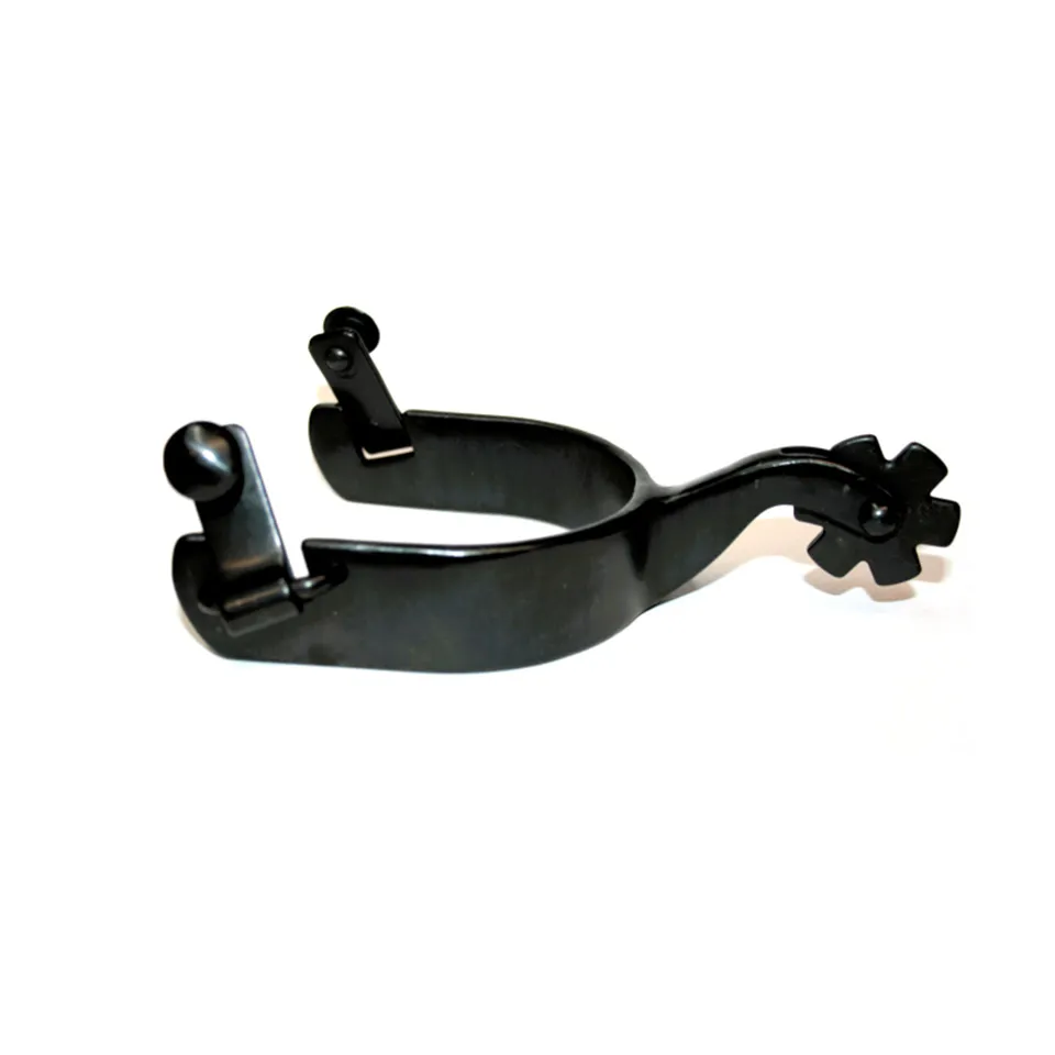 geschwungene Sporenhals ist mit einer Länge von 5 cm ausgeführt. Die im Lieferumfang enthaltenen und vormontierten Sporenräder können durch Bolzen und Splint ganz einfach ausgetauscht werden. So können die Sporen für unterschiedlich ausgebildete Pferde und Reiter verwendet werden. Hier bieten sich die unterschiedlichsten Varianten an Sporenräder an.